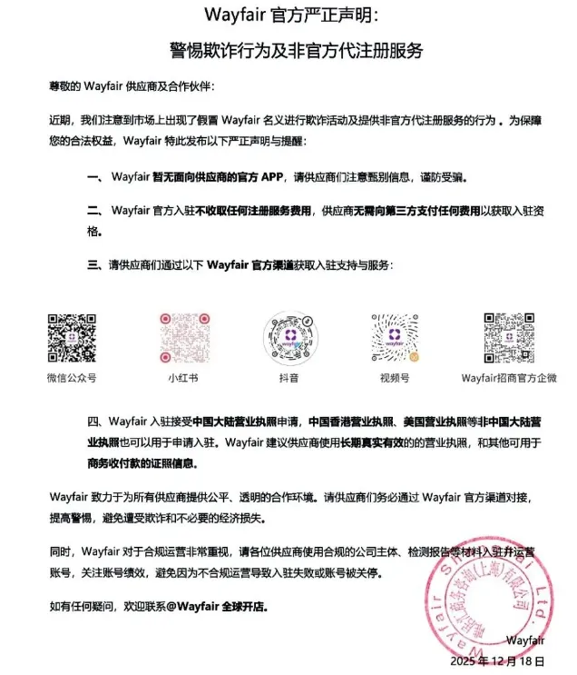 针对此类频发的诈骗事件,Wayfair官方已发布严正声明,明确划定防骗红线:平台入驻全程免费,无任何前期收费项目,卖家无需向第三方支付任何费用以获取入驻资格。凡是以“入驻费、保证金、运营指导费、快速下店费、绿色通道费”等名义索要费用的,均为100%诈骗。