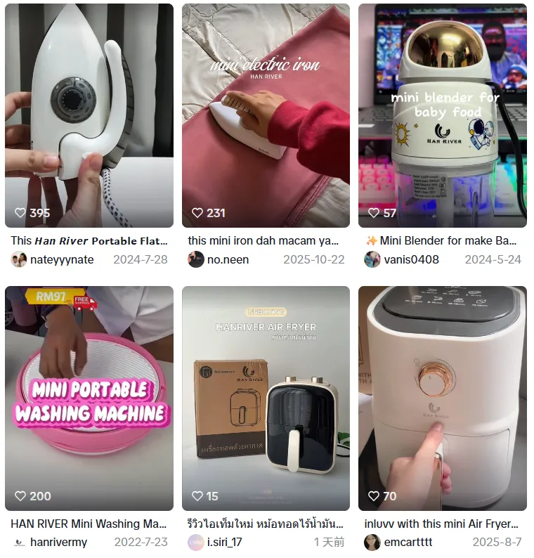截至到2026年1月初,其“@hanriver.official_id”印尼店铺总销售额超2900万美元(约2亿元人民币),其他市场销售额均超百万美元。HAN RIVER产品在东南亚畅销,成为当地影响力较大的中国小家电品牌之一。