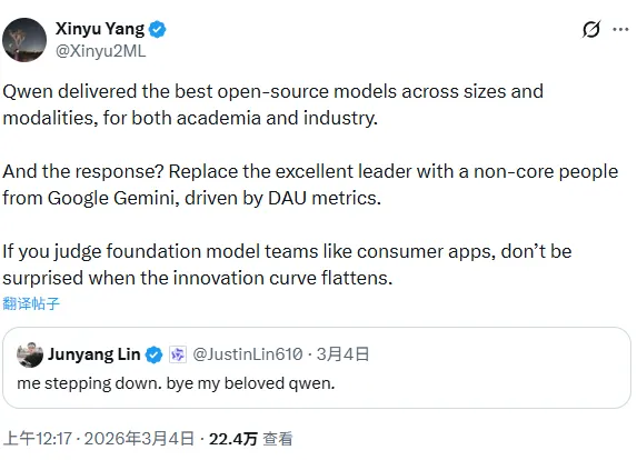 2026年3月4日凌晨,阿里巴巴通义千问(Qwen)技术负责人林俊旸在社交媒体X(原推特)上发布了一条简短的推文:“me stepping down. bye my beloved qwen”(我要卸任了。再见,我亲爱的Qwen)。