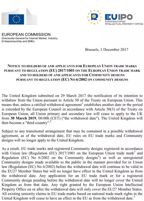近日,欧盟知识产权局官网上忽然发布了一条通知,就英国脱欧后欧盟商标和外观设计在英国境内的效力作出说明。