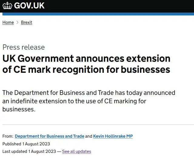 2023年8月1日,英国政府商业和贸易部(DBT)宣布:无限期延长无限期延长企业使用CE标志。