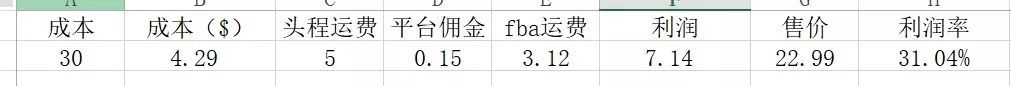 以上图为例,亚马逊所有的资金都是美元表示,所以上图除了第一个成本是人民币其他的都是美金,假如我们的进价是30元人民币,那么换算成美元就是4.29。下一项表示我们的头程运费是5$,(头程费用不清楚的同学,麻烦去复习一下往期节目)。