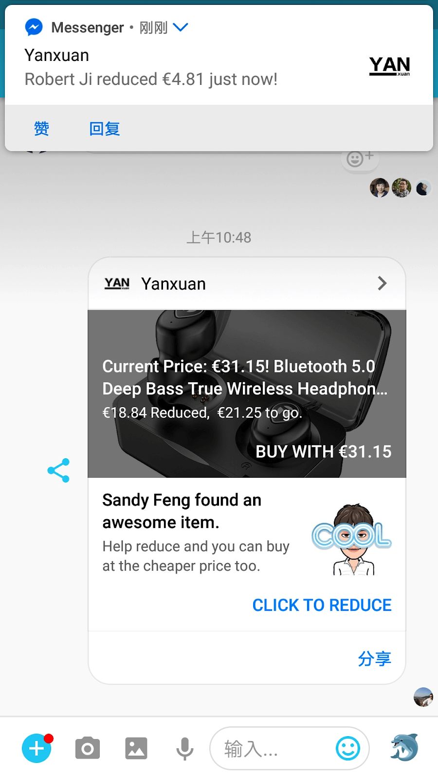 3 顾客分享给其他用户、群后,加入者每砍一刀,收到提示消息