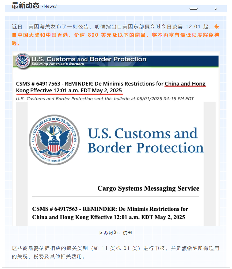 依据美国《1930 年关税法》第 321 条,该政策允许价值不超过 800 美元的商品免征关税。在过去的数十年间,这一政策历经多次调整。