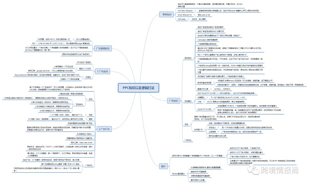 广告讲究的是一个产品的相关度、bid值、预算、CTR、CR。在讲广告之前,我还是希望给大家提个建议,首先打造一个高质量的listing,转化做到20%,标题,店铺名,品牌,主图,价格, 15-20+的图片以及视频的review,QA辅助, 都是可以优化的点。 建立广告之初,就是要先选词了。词的大概种类就是:品牌商品关键词、竞争对手品牌关键词、补充商品关键词、类别外的关键词、广告投放关键词。 这里有几个方式供大家参考。 亚马逊搜索框中的提示关键词 选择5个左右词根,在亚马逊搜索框用《词根+a-z/1-9》的方式查找,all类目下的关键词和产品所在类目下的关键词都找齐,过程会比较麻烦,但是词是最精准的。谷歌关键词也是可以通过这个方式选出来的。 给大家推荐一些工具可以做到 SeoStack-插件:根据种子词关联到的从0-1, a-z的所有热搜词,找出来之后批量导出。 Keywordtool.io:用来做长尾词,亚马逊内部数据,涵盖90%,自动广告补充剩下10% Google Adwords:可以结合google trend 看你的产品是不是属于季节性的。 Adwords :里面筛选关键词,从相关度,电商词汇(购买意向),500+的搜索量选出作为参考 Merchant Words:从相关度,搜索量500+以及相关度做参照。 keywords inspector:使用一项REVERSE Asin PPC就可以了。 用反查PPC的功能,它是在前台去搜索得到的词,可以知道你的对手用 了什么关键词竞价,但你不知道对手的设置broad phrase exact 要对出来的结果反推对手设置的词。 当然还有就是买词,买Asin数据会省了很多功夫。 解密竞争对手自然流量搜索词-Surtime. https://seller打错了..t.cn/7931做亚马逊,应该用一用这个工具,很好用。 用会了上面这些,选词已经是够够的了。 词选好了,就开始建组。 广告组结构:5个campaign法 1.自动广告 检测一下出来的词和产品相关性大不大以及亚马逊是否已经收录你的listing。不大的话说明亚马逊对你的产品定位不准. 一定要坚持跑下去(至少3个月),跑到再也没有新词出来为止 注意:广告跑完1-2个星期,亚马逊还是无法识别你 的产品信息,就需要刷几单你的关键词了,或者修改标题,5点,描述。 2.手动词组 用亚马逊建议的关键词单独建一个词组匹配的广告组 建议的词一定要全部用上,(1)和(2)是亚马逊数据生成的最精确的数据 相对来说比较长尾了 如果数量太少,说明listing的质量差,亚马逊对它的识别度不高。 3.手动广泛 第三方渠道搜索到的词单独创一个手动广泛匹配。精准度远低于亚马逊的建议的词。 4.手动词组 跑半个月到一个月(预算越高需要的时间越短),从(1)(2)(3)的search term筛选出表现比较好的词, 做词组匹配。 选词的门槛参考: Acos: 15-20% CTR: 2-3% CR>8% 初期高预算积累大量数据,为以后发展提供大量数据,后期预算反而会少。 5.精准匹配 从前面(1)(2)(3)(4)中筛选表现最好的词 选词的门槛参考: Acos: 15-20% CTR: 2-3% CR>20% 要会使用数据透视表,直观看出一个关键词的表现 5个组同时运行,做决定的周期建议为一个月,周期越长数据越准确。 否定关键词 1)关键词升级后要在之前组里不删直接Negative掉,自动里否定““广泛”+词组”+"精确";广泛里否定“词组”+"精确";词组里否定"精确"。把表现不好的词放回原来的组。 2)CR=0% CTR>30% / Avg. CPC>$1.5(看是否高于平均CPC) / CR>0% Acos>100% 3)总花销超过10美金的词,根据相关性做否定 不断调整,否定的关键词都是以相关性为原则,最终实现ACOS、CR和CTR在广泛-词组-精准上不断优化的层级结构 另外,广告组可以自己根据情况在里面传进越精细划分的广告组。 小点: 秒杀期间加广告投入 自然排名上首页后可以建议不关,降低出价 竞争对手的品牌词可以当广告词来打以及加入头条广告 促成与别人的关联流量,直接将对方的品牌加标题前几个关键词建一个精准广告组即可 广告预算以及竞价 原则:为越精准的广告付越多的钱 广告组: 词组= 广泛 X 1.5 精准 = 词组 X 2 广告时间段的精细化管理 可以根据自己的销售数据判定产品什么时候会达到一个高转化期,还有低迷期。高峰期调成1.5倍,低迷期降低。 最直接就是在后台的业务报告可以直接看到产品在哪个时间段销售最多 工作日转化比较高。周末转化比较低,预算调低 再讲一个就是关于买词,买到的数据,该怎么用,首先确定自己的产品属性。 在一份数据表里面我们可以看到有搜索关键词,点击关键词,加购物车关键词以及购买关键词。 1.搜索词/点击词加入广发匹配 2.加购词放入词组匹配 3.购买词放入精准匹配 当你发现在一份数据里面有些词是重复的词,就按数据的高低选入。 PPC报表的用处 1.Performance over time 可以按照DAYS, MONTHS YEARS 来显示,日期上面最为精确。可以通过这个表格大致分析出来哪一天点击的人多,周末和工作日的区别,可以细化去分析每一天的 total spend 和点击 大幅下降和增加的原因。 在表现好的某一天加大预算,因为budget会偏向表现好的Keyword,吃掉其他词的机会。 2.Performance BY SKU 用于针对变体下的各个SKU 进行测试,有助于选择最好的,避免竞争, 而且监测打造爆款的SKU发展。 类似的产品最好做成一个变体,打一样的广告,跑半个月,从其中选出最好的一个SKU。最后把所有变体广告的预算放在它上面。 经验:一开始不做变体,作为单独的SKU养,做到比较好了再合并。 3.Performance by placement 可以告诉你哪些广告组应该开启或者关闭Bid+ 一个广告组在top of search 的转化非常高的时候可以考虑为其开B