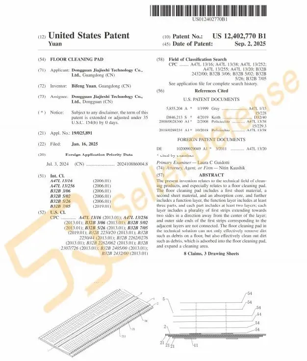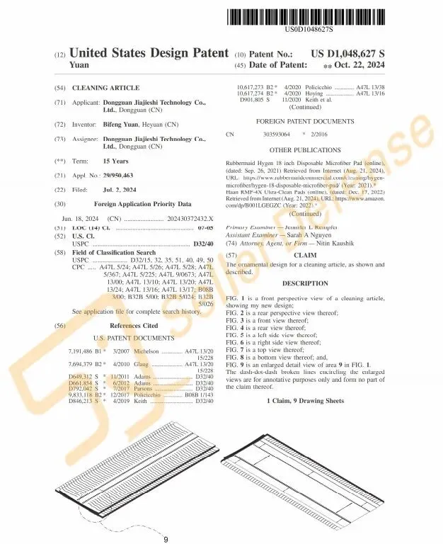 原告 Dongguan Jiajieshi Technology Co 是一家国人公司,主要研发、制造并销售地板清洁垫等清洁用品。本案涉及实用新型专利和外观专利产品为一款地板清洁垫,这款可替换拖布垫安装简便,表面布满数条纹理高效吸附灰尘,用后即可直接丢弃省时省力。