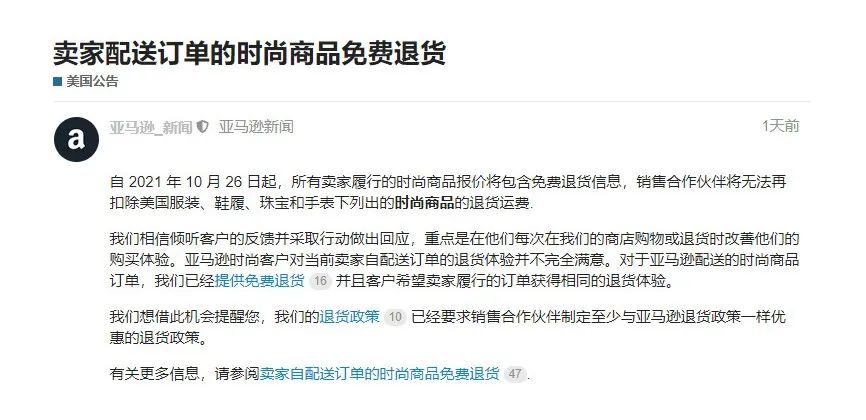 亚马逊还说到:“为了提供最佳的客户体验,对于亚马逊配送的时尚商品订单,我们已经提供免费退货并且客户希望卖家履行的订单获得相同的退货体验。我们想借此机会提醒您,我们的退货政策已经要求销售合作伙伴制定至少与亚马逊退货政策一样优惠的退货政策。”