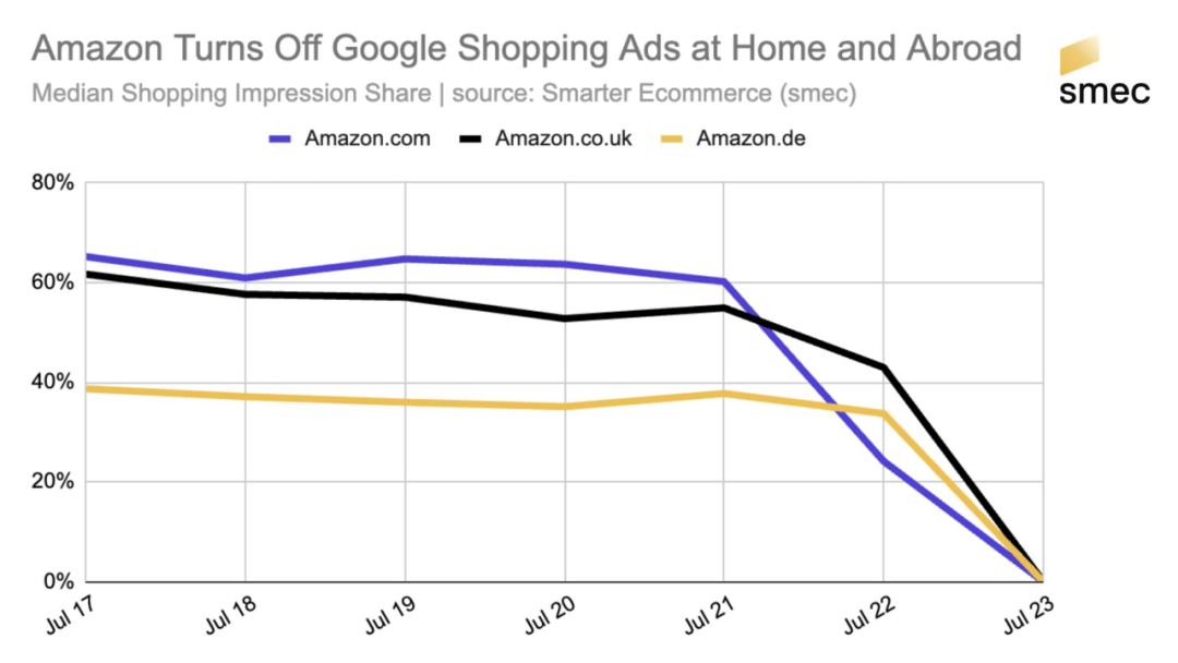 截至7月中旬,亚马逊在美国谷歌购物广告中的展示份额已暴跌至接近0%,明确表明其完全退出了美国市场的竞价。
