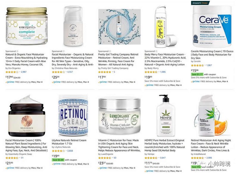 首先,D在亚马逊的搜索框中输入了“natural moisturizer”(天然保湿霜),因为她想要一款完全不含鲸蜡醇等刺激性化学物质的产品。如下图所示,亚马逊在搜索结果的第一页,为D展示了各种各样的产品,从成分“natural”(天然)到“organic”(有机)的应有尽有。并且每一款产品都在宣传自己拥有特殊的“魔力”成分,能够解决消费者的想到的所有问题,但明显这是不可能的。