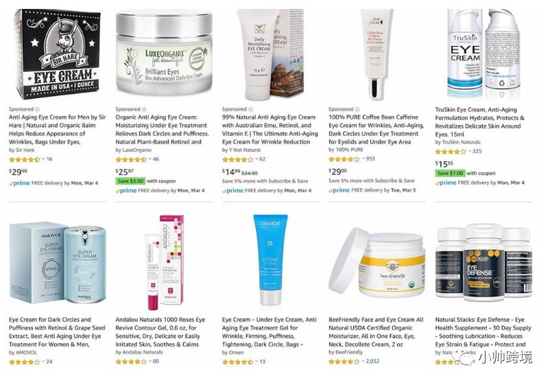 在经过一番搜索后,D发现自己的搜索范围太广了,或许她应该购买特别针对眼部的眼霜,而不仅仅是面部通用保湿霜。于是,她重新在亚马逊搜索栏输入了“soothing natural eye cream”(舒缓天然眼霜)。如下图,结果也是喜忧参半,大多数产品更关注“anti-aging”(抗衰老),而不是D需要的修复、舒缓等功能。