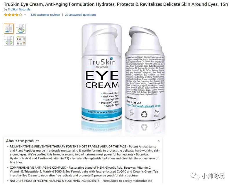 这款产品的listing非常有说服力,尽管listing中并没有特别提到产品可以用到眼睛下方的区域,review中也没有。但好评者直呼产品“非常纯粹”、“非常好”等等。