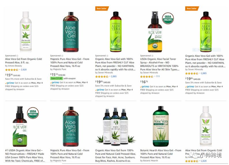 在看完了一个又一个产品后,D决定尝试其它方法寻找她需要的产品,这次她打算从成分入手,于是她输入了“100% pure aloe vera”(100%芦荟成分)。键入这么一个搜索词似乎是有用的,亚马逊并没有如往常给出大量令人困惑的产品,如下图: