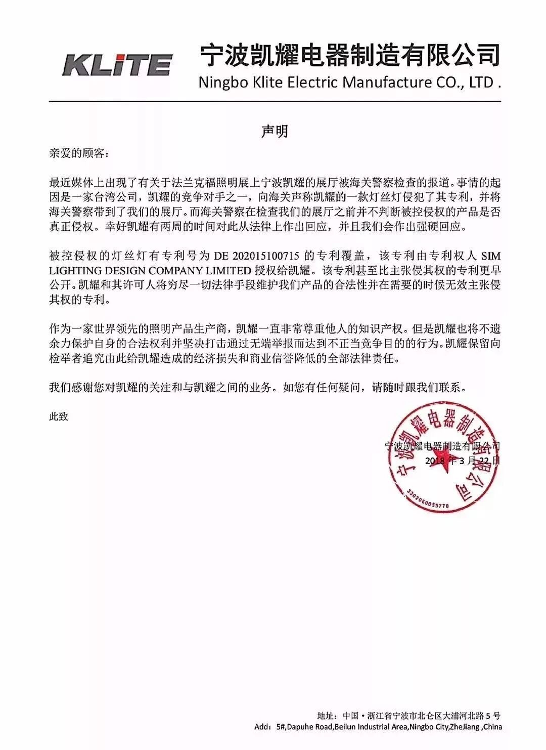 国内巨头也遭投诉 活动现场展位被查封 孰是孰非 小编来讲讲 在我们跨境卖家参加一年一度的CCEE选品大会(深圳站)期间,2018德国法兰克福照明展会也在德国火热进行,展会的最后一天,即23日,国内LED灯丝灯厂商巨头--宁波凯耀电器制造有限公司被举报其产品侵犯LED灯丝灯专利,带来严重负面影响。据称,举报方为液光固态照明有限公司。 法兰克福照明展会(Light+Building)是目前世界上最大的国际照明灯饰贸易展览会之一,每逢双年举办。作为专业领域内最重要并且最大的展览会,在照明行业倍受关注,认可度极高。 当传出在法兰克福照明展会上,国内照明巨头企业“宁波凯耀电器制造有限公司”被举报其产品侵犯LED灯丝灯专利,展位遭到查封整改,业界顿时沸腾。 (宁波凯耀在展会现场) 宁波凯耀方面即时对外就此事发表了声明澄清----被控侵权的灯丝灯拥有德国专利,专利号为DE 202015100715,凯耀是经过专利权人SIM LIGHTING DESIGN COMPANY LIMITED授权使用的,不存在侵权问题,并表示将会起诉。 (德国专利) LED灯丝灯,自2008年面世后,发展并不顺利,直至2014年被大众知晓,2016年成功逆袭,目前在欧美地区使用率居高。 需要指出的是,宁波凯耀是国内生产制造LED灯丝灯的知名企业之一,其LED灯丝灯专利技术从2015年起,经浙江锐迪生光电有限公司授权使用。 锐迪生公司生产的LED灯丝灯是由浙江大学已退休研究员---葛世潮带领团队研发的。第一个LED灯丝灯的专利是在2014年提交申请,此后,锐迪生陆续提交了16个与LED灯丝灯相关的专利申请。 (中国专利) 纵观宁波凯耀因被举报侵权导致在海外展会上的摊位被查封到声明澄清的经过,我们的卖家也要思考在跨境平台上出口销售产品时应该如何避开侵权和有效维权。 就知识产权侵权而言,主要是版权,商标和专利三大类型。 版权方面,因为电商卖家们通过在网站平台上以图片形式展示产品,而不少卖家会选择在网上的产品图库下载图片后直接使用。虽说是免费图片库,但也不排除版权。因此,产品展示图,卖家还是自己多花心思去拍图,展示自己的产品特点。 商标侵权,表现为产品图上有他人的商标和产品描述中使用他人商标。不过,相信卖家们都不会在产品描述中使用他人商标。但是,存在产品图上的产品标着他人商标,而描述中却标榜自己商标的情况。(在上周分享的侵权OFF-WHITE品牌的文章有图有真相)如果产品图上的文字/图案标有TM 或者 ®,那该文字/图案即是商标。 专利侵权情况就比较复杂了。如果单纯进货销售的卖家,应在选品时通过厂家了解产品的外观设计和技术发明两方面的专利情况。如果从厂家方无法获悉外观专利和技术发明的情况,卖家可以对知名品牌进行简单的搜索,看看知名品牌的产品外观,查查其专利情况,最后和所选产品进行对比,即可大致判断侵权风险的高低。 在平台上销售,最怕就是被投诉知识产权侵权。不管青红皂白,listing一旦被投诉即时被封。避免被他人投诉,明智的卖家则会选择第一时间宣示主权,即在产品的商标右上方标 ®,对有外观专利保护的产品,在产品说明的地方,加上相关专利的说明。附加专利说明,最好还保留网站截图证据,目的是在被投诉专利侵权后,可以向亚马逊申诉提供有力证据。 小编浅见如上,希望大家也分享自己的经验和看法。
