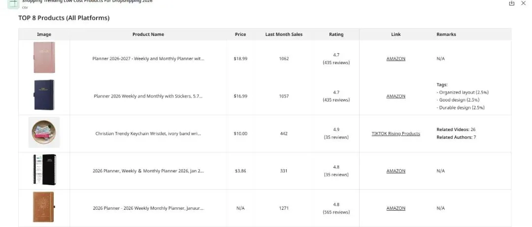 而且Accio还会去网站上自动爬取数据,然后提供一份建议售卖的清单,打开如图: