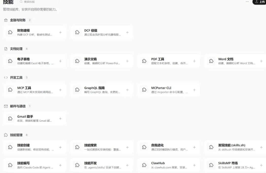 3.可以直接安装技能,支持自己上传自定义技能,不仅可以创建新的还可以更改属性。