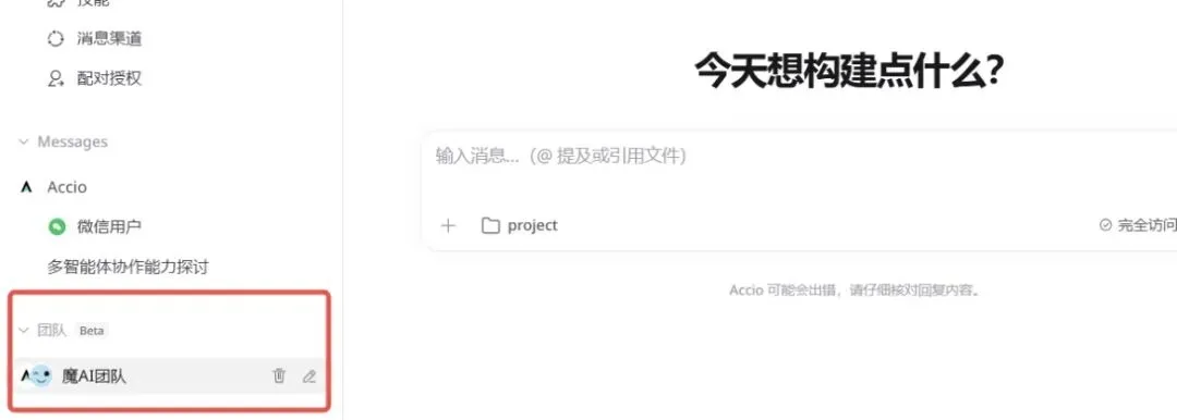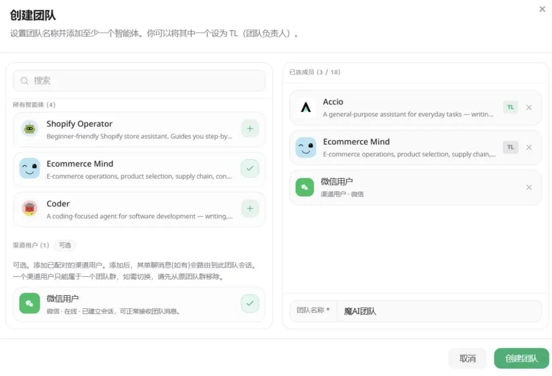 4.据用户使用反馈,还支持多智能体协同作战,可以添加微信和多个智能体,创建团队。