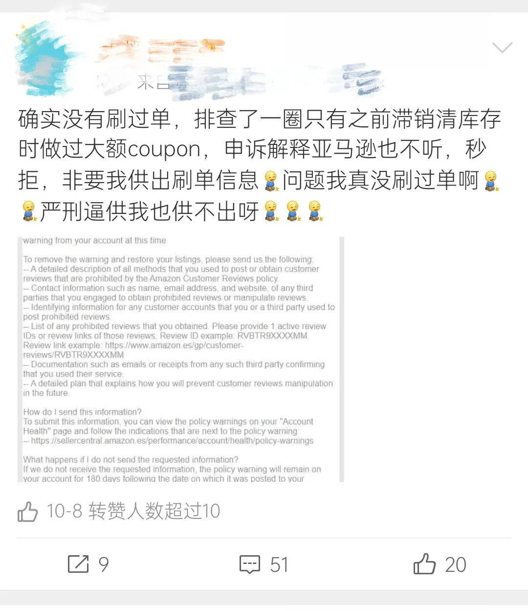 也有卖家在微博上表示自己确实没有刷过单,排查了一圈只有之前滞销清库存时做过大额coupon,跟亚马逊申述解释也不听,秒拒,非要卖家供出刷单信息。也许就是因为做过大额的coupon,力度较大,出单也比较多,引起了亚马逊系统的注意,导致被判定为刷单行为。