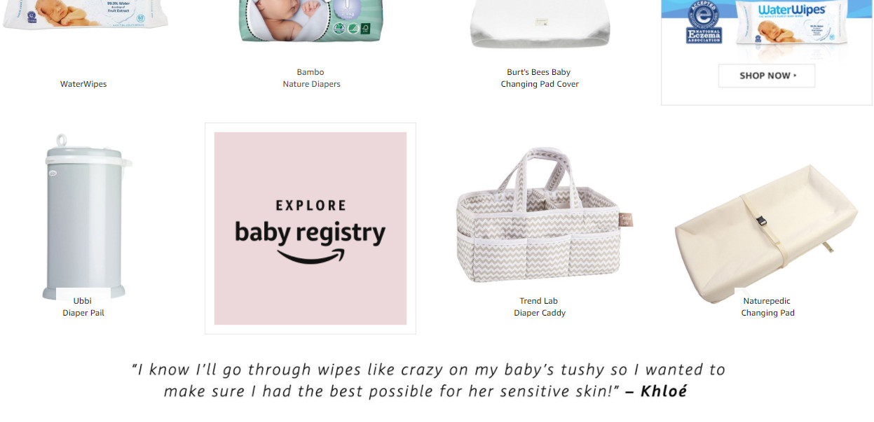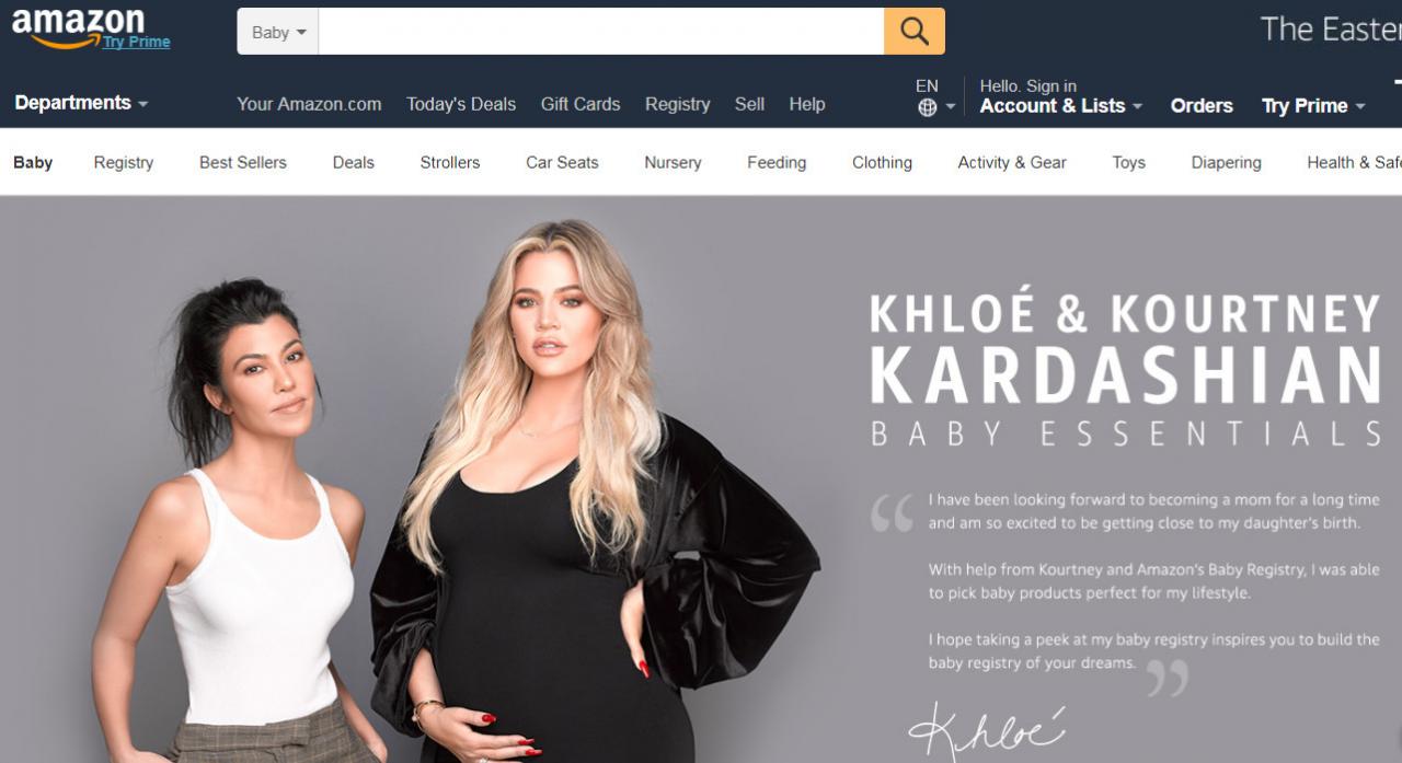 ↑↑在亚马逊Baby主页,卡戴珊盛赞亚马逊的“宝贝计划”,吸引更多妈妈加入baby registry队伍