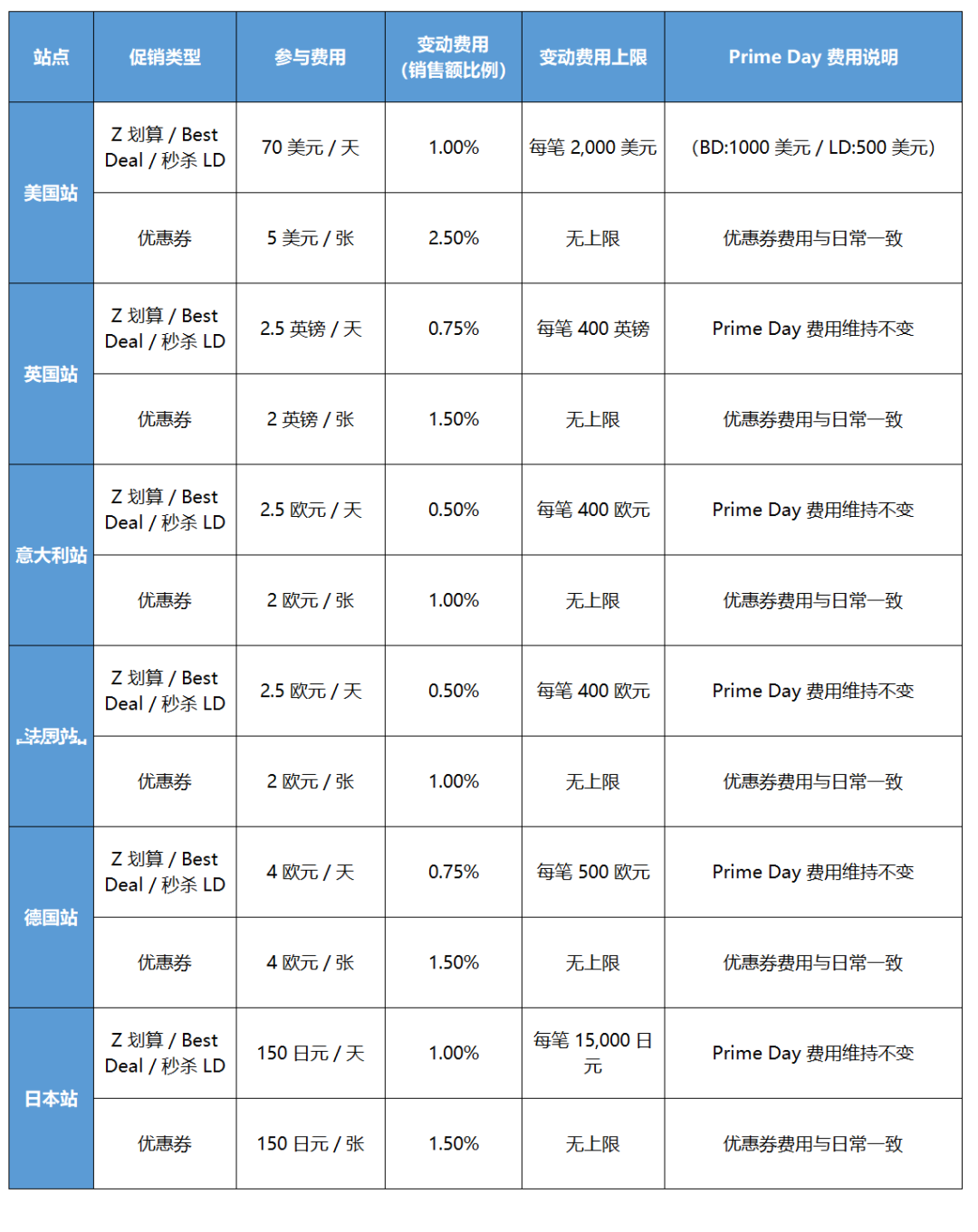 6月2日后, 亚马逊的各个站点的Z划算、LD、优惠券费用具体变动如下: