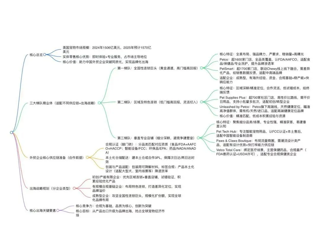 美国作为全球最大的宠物产品消费市场,其本土实体商业体生态呈现出多层次、差异化的发展格局。据美国宠物产品协会(APPA)数据显示,2024年美国宠物产品总销售额已达1506亿美元,预计2025年将进一步增长至1570亿美元,其中实体零售渠道凭借即时体验、专业服务等核心优势,依然占据市场主导地位。对于中国外贸企业而言,精准把握美国实体宠物用品商业体的梯队特征与合作逻辑,是突破同质化竞争、实现品牌化出海的关键路径。本文将系统梳理适配外贸合作的美国本土实体商业体,按市场影响力、合作门槛及品类定位划分为三大梯队,结合行业监管政策与成功案例,为不同类型供应链企业提供定制化出海战略参考。