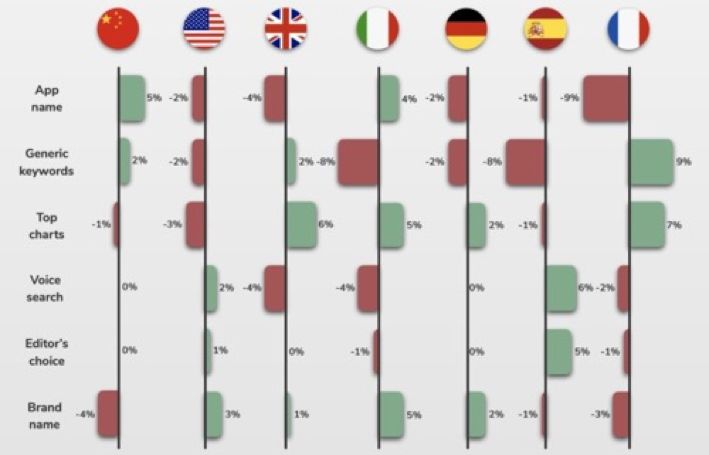 41% 的 APP 用户将 APP 名称作为搜索的关键词输入,而 21% 的用户会使用通用性质的关键词来进行搜索,17% 的用户会浏览排行榜后再做决定。在美国、英国和意大利,品牌名称搜索更占主导地位,突显出了用户搜索 APP 时的方式存在明显的地区差异。