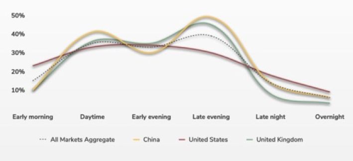 应用程序搜索在全天任何时间段都会发生,但在深夜会更多,这种现象在中国尤其明显。因此,营销策略应该与消费者浏览 APP 的高峰期相适配。