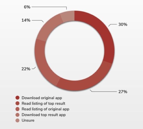 在搜索之后,61% 的用户则会浏览该 APP 的展示页面。如果用户在搜索结果页面中发现一个他们没有搜索到的应用程序,41% 的用户会在下载他们最初选择的那个 APP 前查看这个新出现的 APP,这表明搜索广告促进了 APP 的发现。而最终只有 30% 的人会继续下载最初选择的那个应用程序。
