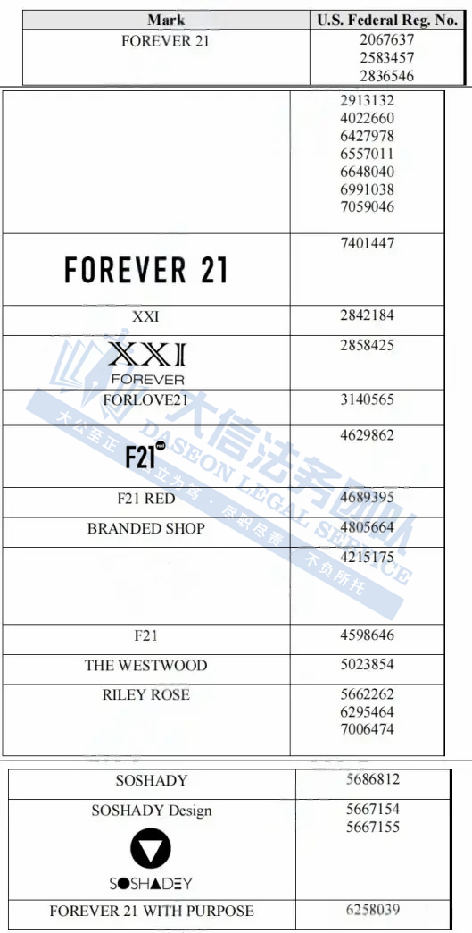 此案为商标维权,目前已经成功冻结了88家店铺,涉及原告在美国注册了FOREVER 21及FOREVER 21 WITH PURPOSE等14个商标,包括文字商标以及图形商标,以下是涉及商标的具体信息,未经授权不得擅自使用,侵权风险极高!跨境卖家尽快检索下架,否则会有TRO侵权风险!