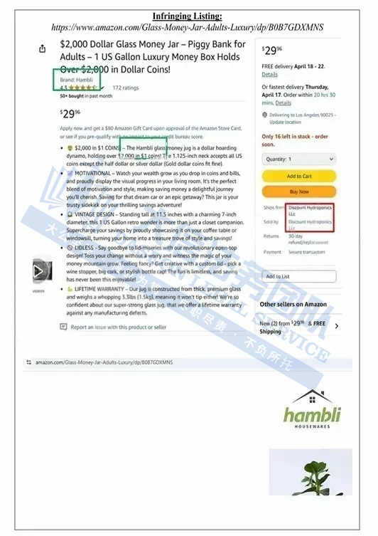 此案为商标+版权维权,涉及一项美国注册的“HAMBLI”文字商标,除此之外,公司还为产品玻璃存钱罐创作的摄影版权作品,以下是涉及商标版权的具体信息,未经授权不得擅自使用,侵权风险极高!跨境卖家尽快检索下架,否则会有TRO侵权风险!