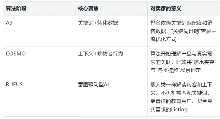 在Rufus升级前,亚马逊的搜索逻辑经历了从A9到COSMO的渐进式变革,而此次Rufus的全面落地,标志着算法正式进入“意图驱动”的终极阶段。这三次算法迭代的核心差异,直接决定了卖家的流量获取逻辑,我们用清晰的对比帮大家理清脉络: