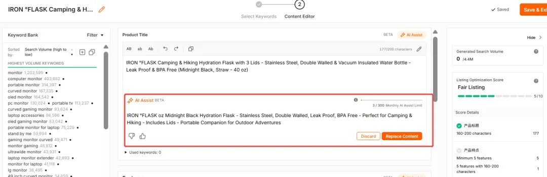 这里可以借助Jungle Scout软件的“Listing生成器”,输入提炼的核心需求词和产品参数,就能快速生成符合Rufus偏好的自然语言内容,同时保证关键词的自然融入。
