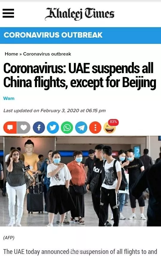 根据阿联酋民航部门发布的安全决定,自2020年2月5日10:00起暂时停飞阿联酋往来北京外全部中国大陆航线,受影响的包括阿联酋航空和阿提哈德航空两家公司的上海、广州、成都等航线。