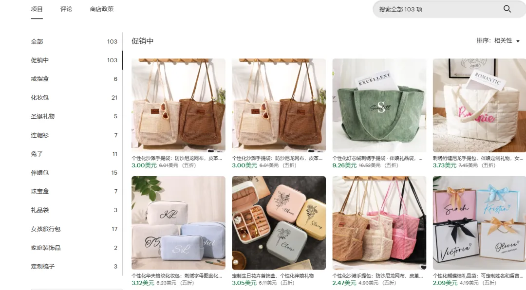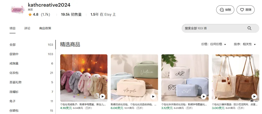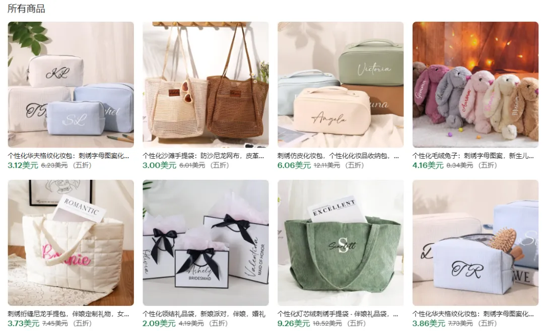 这是Etsy的核心竞争力,比如上面这家店铺的核心卖点——所有商品都能刺绣字母、刻字,不管是毛绒兔子、化妆包,还是沙滩手提袋、伴娘包,都能定制专属标识。国内卖家选品,一定要避开“无差异”商品,比如普通的帆布包、普通的化妆盒,这些商品在Etsy上根本卖不动。