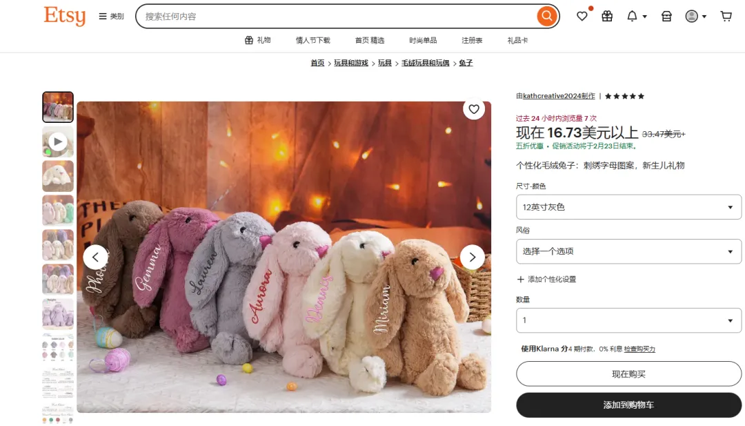 比如它家的爆款商品,个性化毛绒兔子,刺绣字母图案,主打新生儿礼物,促销价只要16.73美元,原价30美元左右,直接五折,性价比拉满;