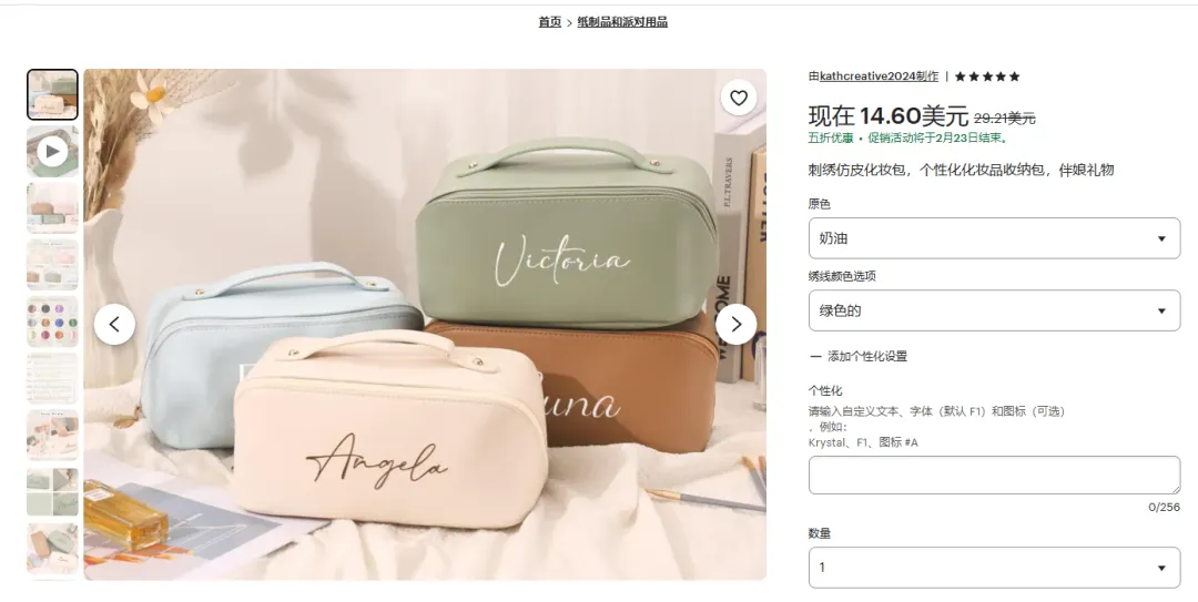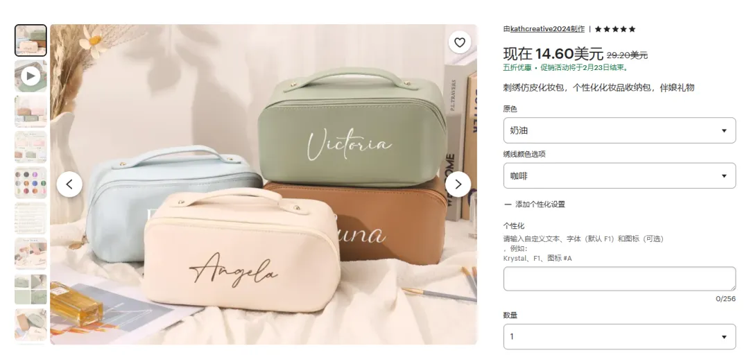 还有刺绣仿皮化妆包,个性化设计,既能当化妆品收纳,又能做伴娘礼物,售价14.60美元,也是五折优惠;还能个性化定制,不管是日常用还是旅行用都合适,这样的商品,想不热销都难。
