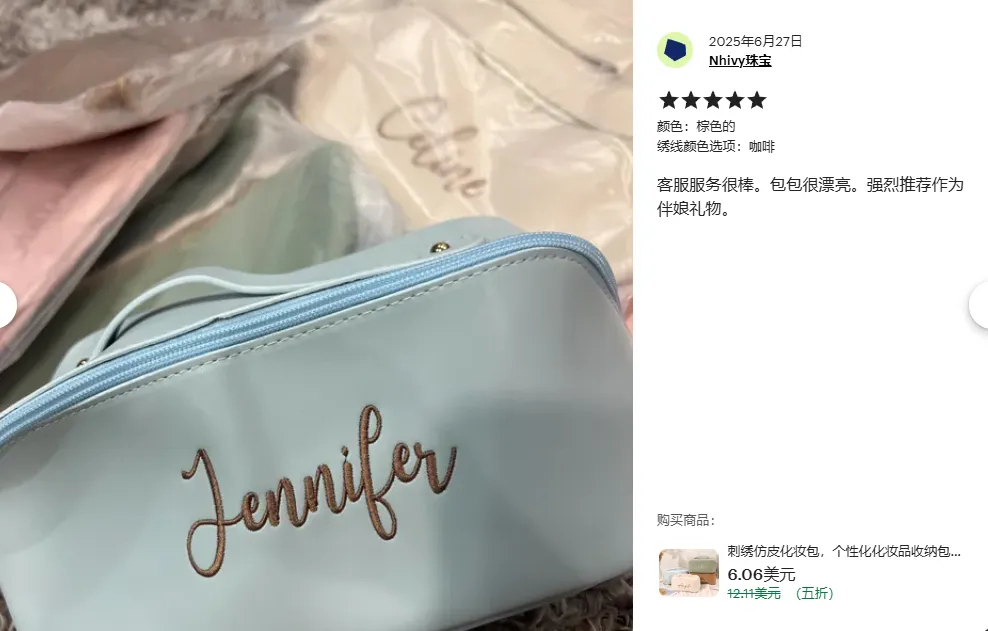 3)商品描述要通俗易懂,突出3个核心:材质、个性化服务、用途,比如“刺绣仿皮化妆包,可刺绣名字/字母,适合伴娘礼物、日常收纳,小巧便携,五折优惠,性价比拉满”,不用写太复杂的英文,简单明了就行,哪怕英文不好,用翻译软件翻译,再修改一下,保证通顺,让买家能看懂就行,重点是让买家知道,这个商品能定制、材质好、用途广。