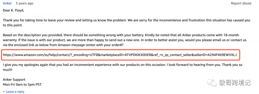 细致的差评回复,同时有一点非常的关键,邮件内留下了联系的入口,通过这个入口可以引导用户取得主动的联系,进而可以有机会提供解决方案,增加差评的移除率,这一点值得所有的亚马逊卖家去学习。