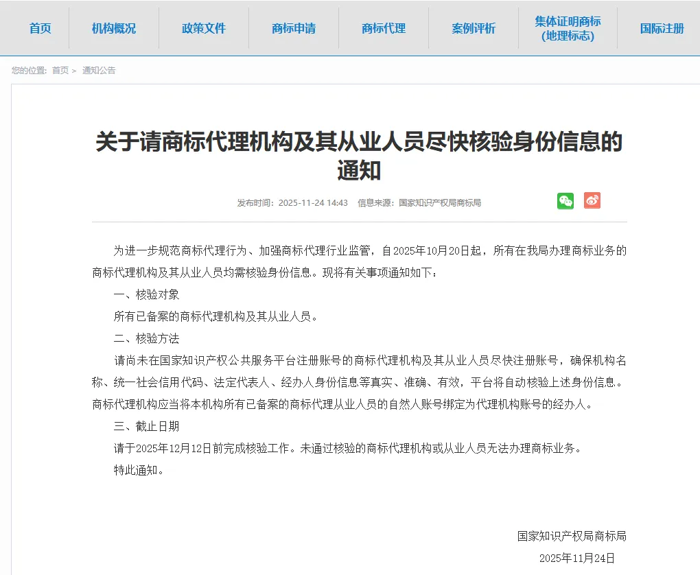 要求自2025年10月20日起,所有在商标局办理业务的商标代理机构及其从业人员均需核验身份信息。2025年12月12日前未通过核验的商标代理机构或从业人员无法办理商标业务。