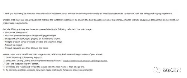 从今年7月开始,亚马逊将全面整治产品图片,凡是主图不符合要求的 listing 都将禁止显示,买家在前台会无法搜索到这款产品。近期,不少卖家反应收到亚马逊的邮件,如图: