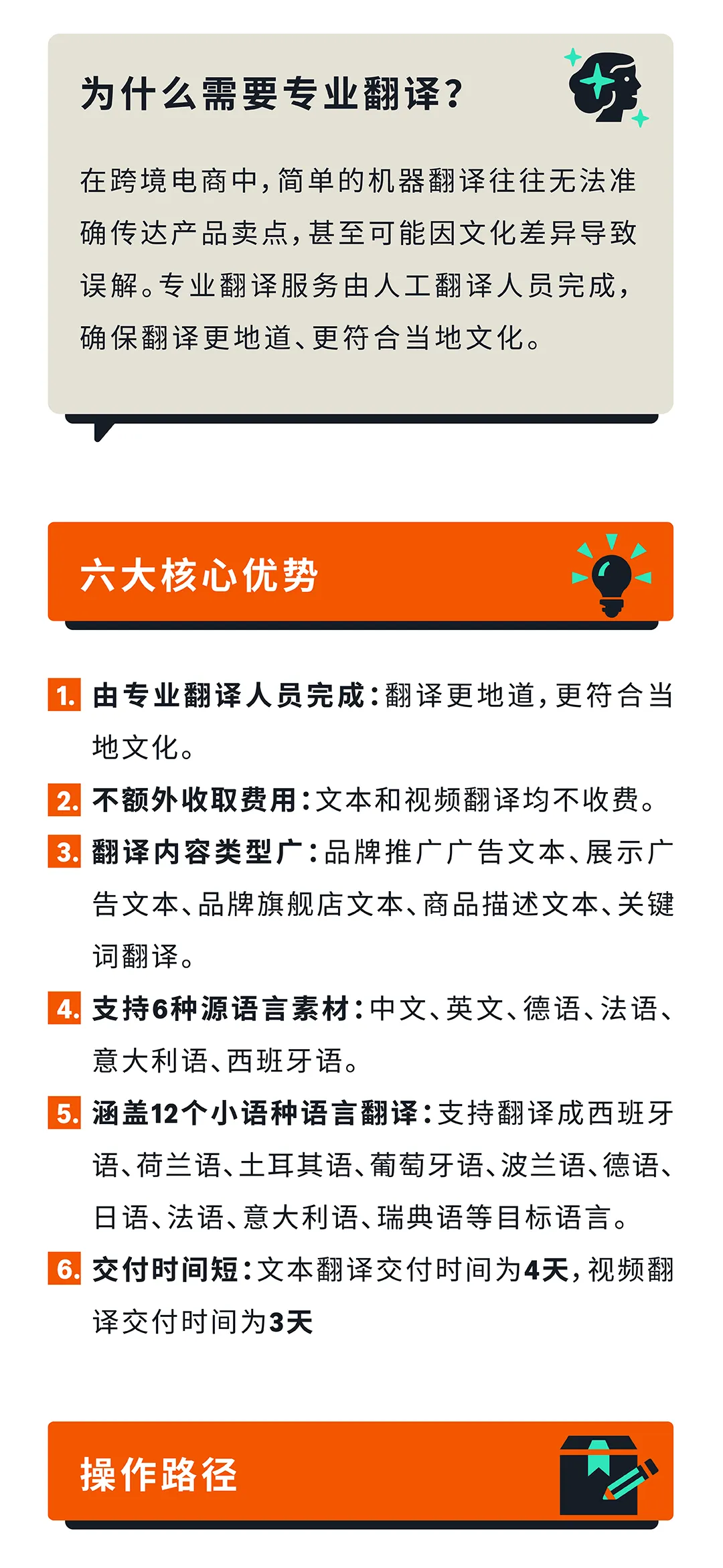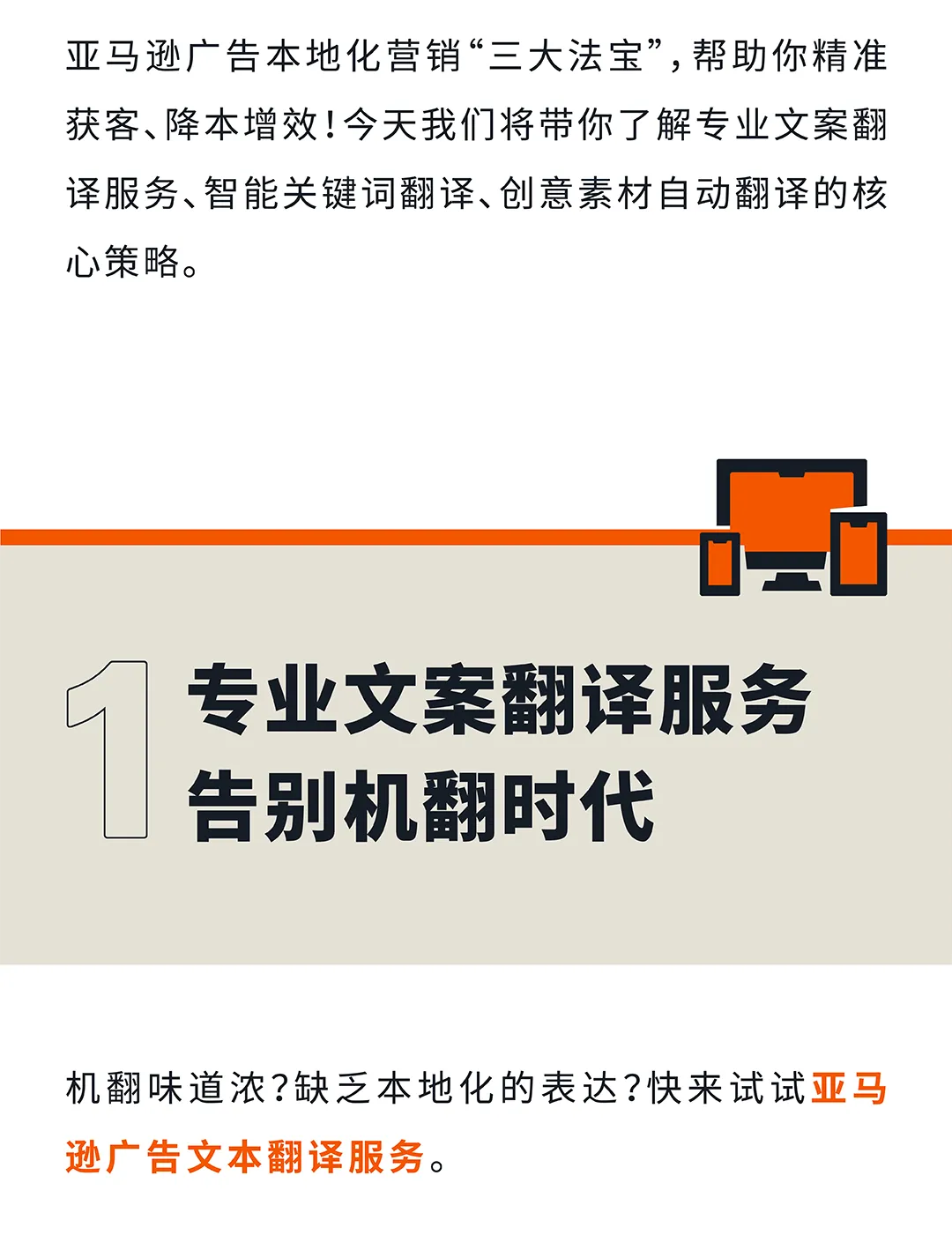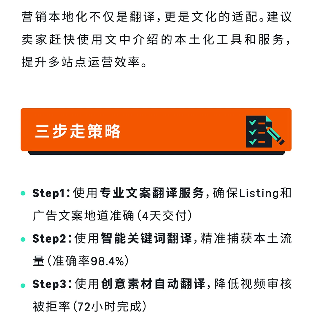 案翻译服务(4天交付,支持12种语言)、智能关键词翻译(准确率从82%提升至98.4%)、创意素材自动翻译(72小时完成,降低审核被拒率)。专业文案翻译服务由人工翻译人员完成,支持品牌推广广告文本、展示广告文本、品牌旗舰店文本等多种内容类型,不额外收费。智能关键词翻译支持多种语言输入,一键翻译成目标站点关键词,节省找词时间。数据显示,使用关键词翻译后,ACOS从35%降至10%,曝光量提升560%,点击率从1.52%提升至4.19%。创意素材自动翻译服务自动识别目标语言,翻译完成后广告活动自动启动,目前支持德国、法国、意大利、西班牙、日本、墨西哥、瑞典等站点。本地化营销三步走策略:先用专业文案翻译确保内容地道,再用智能关键词翻译精准捕获流量,最后用创意素材自动翻译降低审核被拒率。#亚马逊平台 #亚马逊跨境 #亚马逊卖家 #亚马逊运营 #亚马逊广告