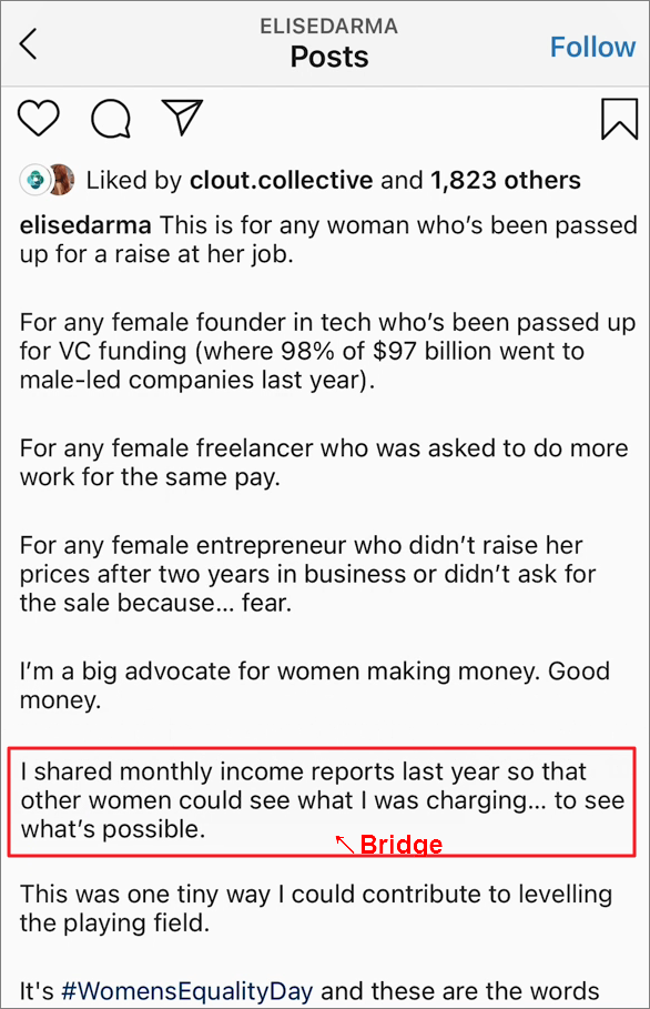 桥梁:一个短短的句子,再次提醒粉丝为什么他们应该关注这个帖子,对他们有什么好处。然后顺势引出下一个元素 行动号召。