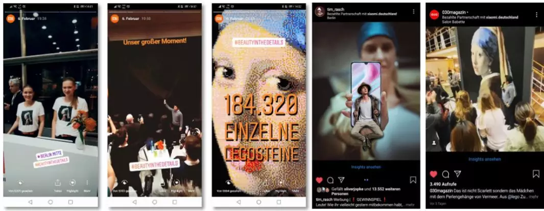 在新机推广活动当天炒热了话题,就要让它热下去!因此小米还持续推出线下互动,和小米本土团队合作,在柏林各处“藏”了以《带珍珠的少女》为主题的艺术贴画,鼓励大家在海外社交媒体关注小米主页,并发布自己在柏林找到的“珍珠少女”