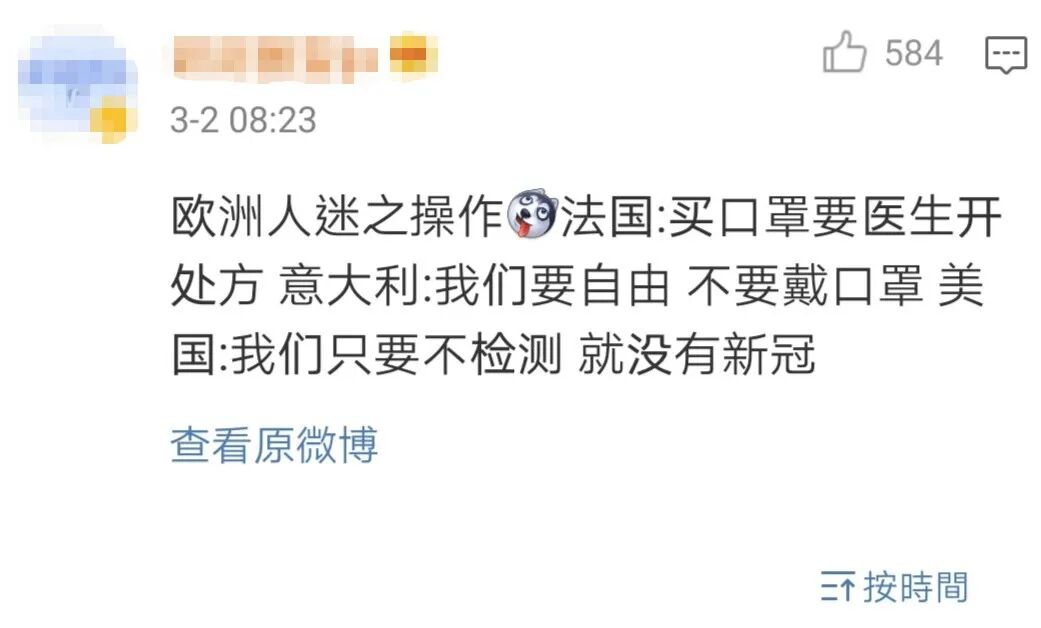 法国:买口罩要医生开处方 。 意大利:我们要自由,不要戴口罩。 美国:我们只要不检测,就没有新冠。