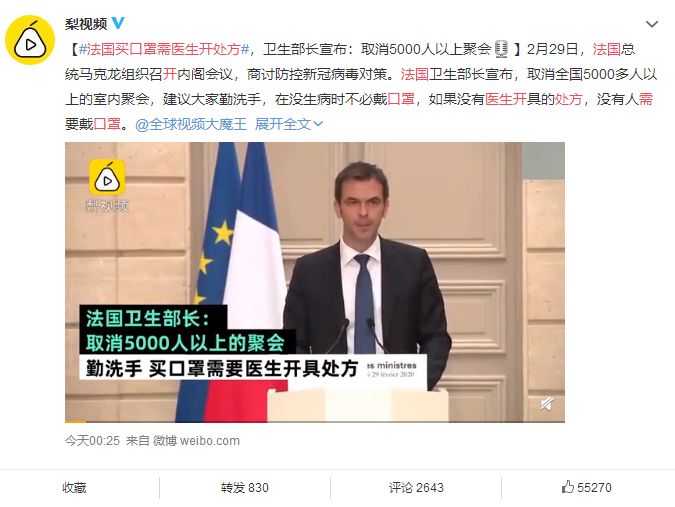 今日,话题#法国买口罩需医生开处方#登上了热搜。2月29日,法国总统马克龙组织召开内阁会议,商讨防控新冠病毒对策。法国卫生部长宣布,取消全国5000多人以上的室内聚会,建议大家勤洗手,在没生病时不必戴口罩,如果没有医生开具的处方,没有人需要戴口罩。