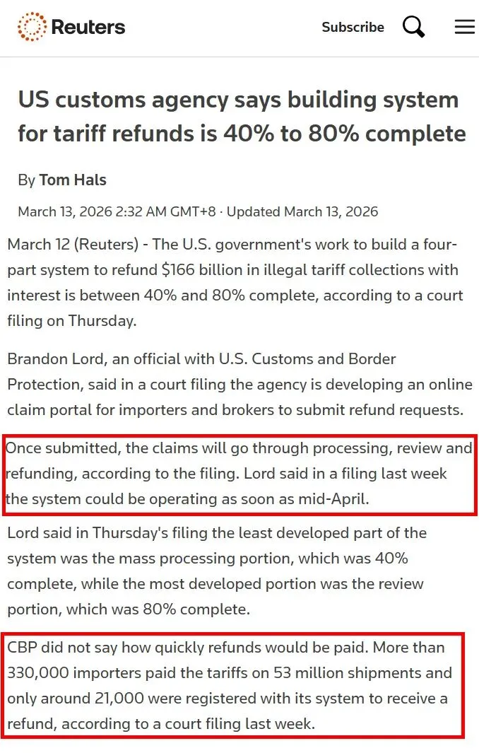 https://www.reuters.com/world/us/us-customs-agency-says-tariff-refunds-system-between-40-80-complete-2026-03-12/?utm_source=chatgpt.com