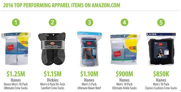据报告显示,去年亚马逊的服装畅销产品中,有近2/5是男性、女性内衣或贴身内衣,销售额总计4.15亿美元。