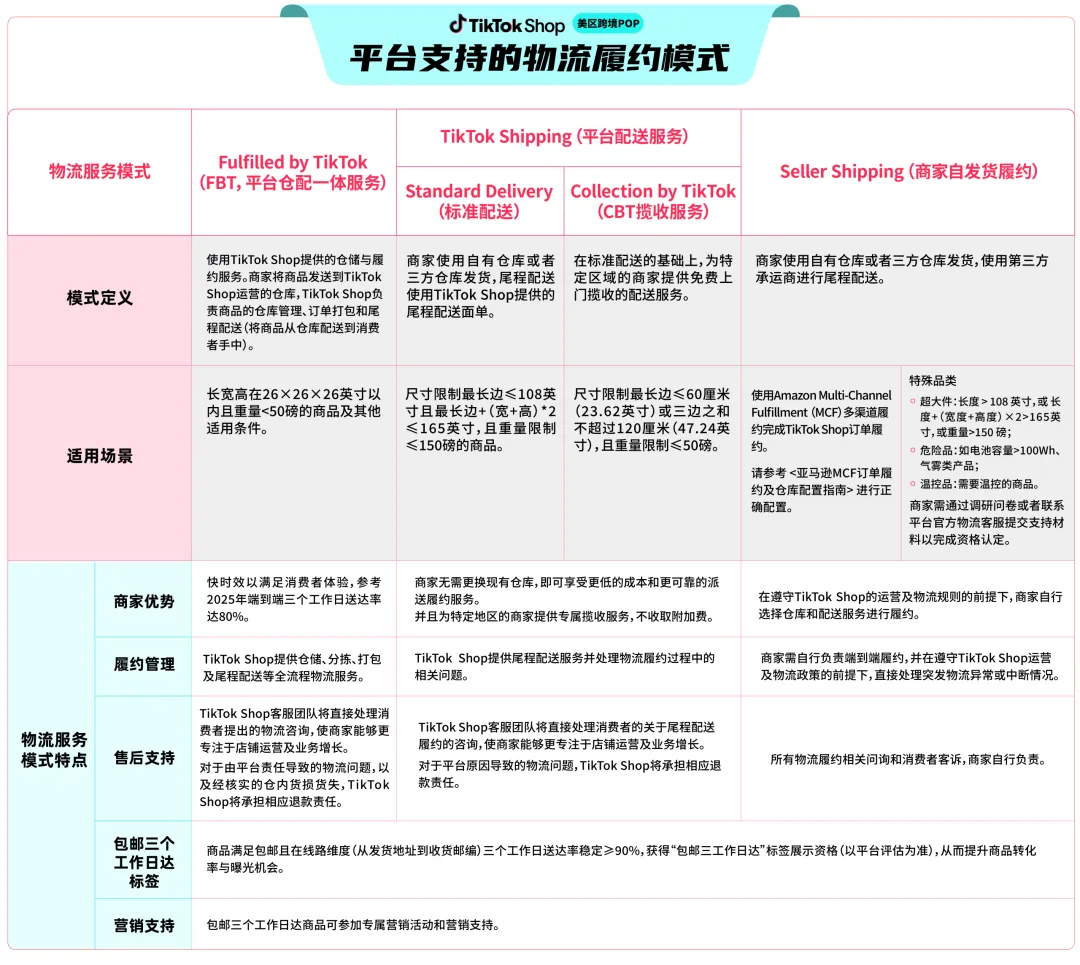 TikTok Shop始终致力于为商家提供多样化、高效率的物流履约选择,美区跨境POP商家可以根据对应业务需求,灵活选择物流履约模式。