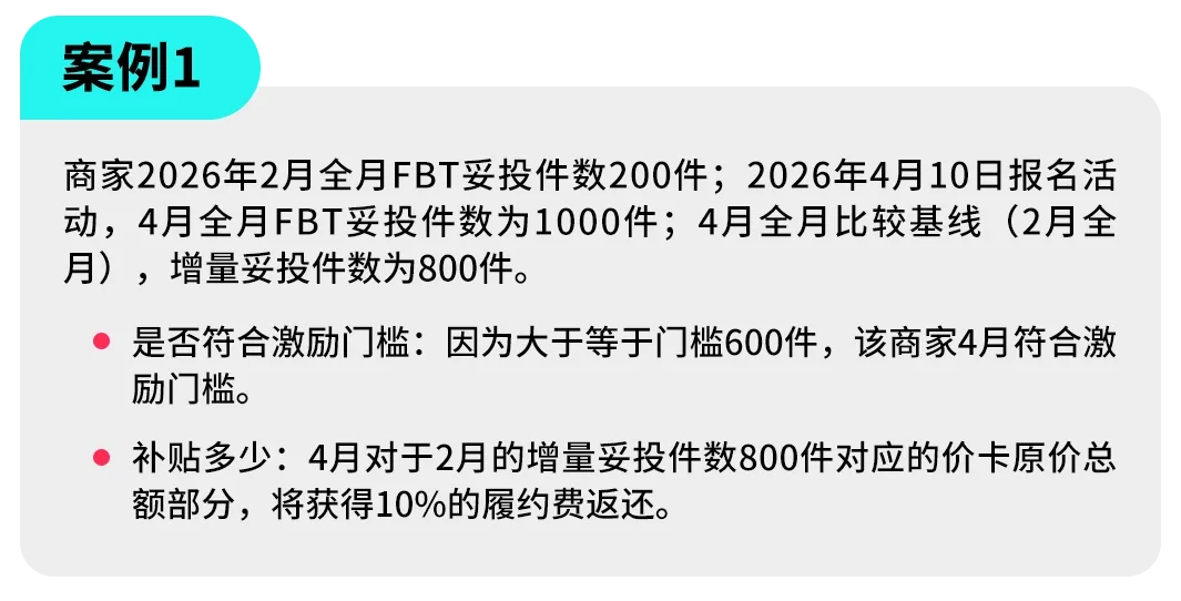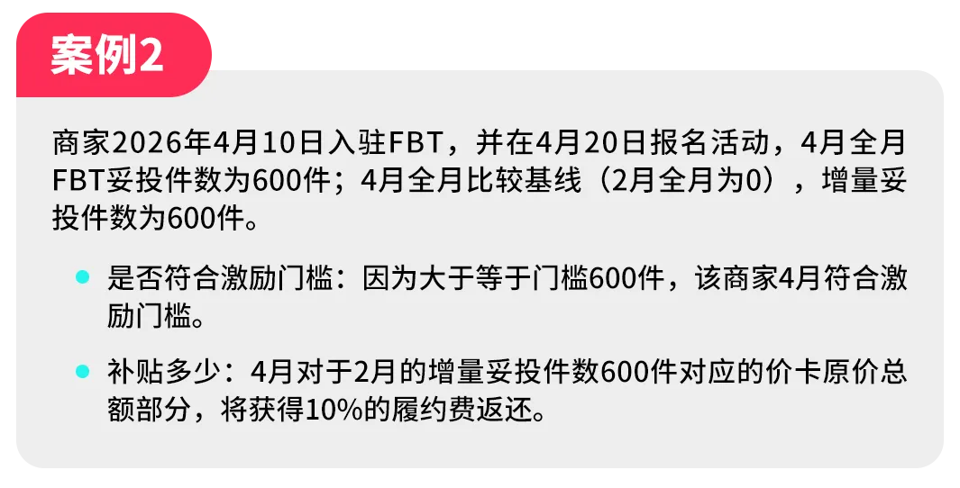 对于在2026年4月至9月期间,任一自然月内相较2026年2月实现600件及以上增量FBT妥投件数的商家,将有资格获得针对该增量件数对应FBT履约费10%的返还激励,单件返还上限为1美金。每个月将单独核算,不跨月结转。