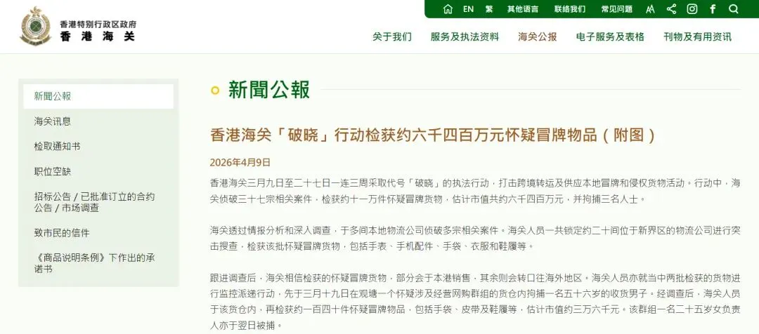 4月9日,香港海关严打跨境转运及本地冒牌货流通,其公布「破晓」专项行动成果: