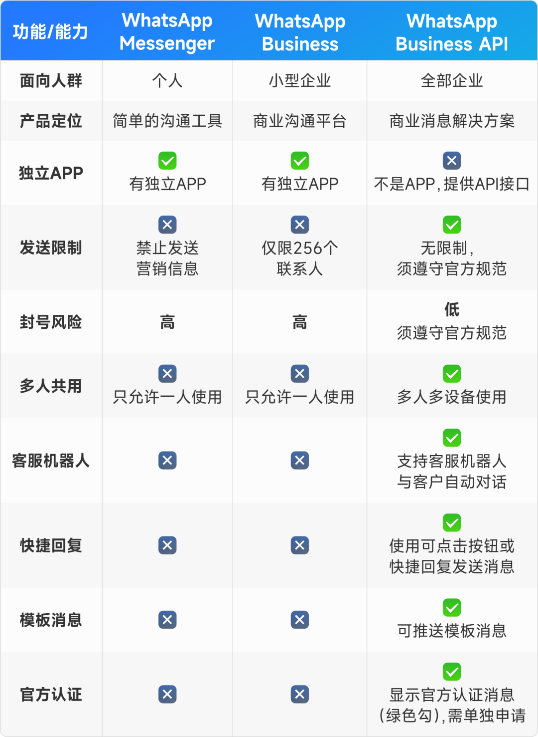 关于WhatsApp Messenger、Whatsapp Business、WhatsApp Business API(WABA)更多不同,小满也在前面的文章已经详细介绍过